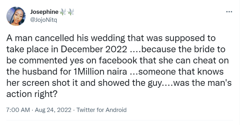 A man cancelled his wedding that was supposed to take place in December 2022 ….because the bride to be commented yes on Facebook that she can cheat on the husband for 1Million naira …someone that knows her screen shot it and showed the guy….was the man’s action right?